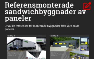 Urval av referensmonterade sandwichbyggnader från våra erbjudna paneler från år 2022 till år 2024. Byggnaderna är till största delen utförda av moderna PIR-paneler eller av paneler med mineralull.