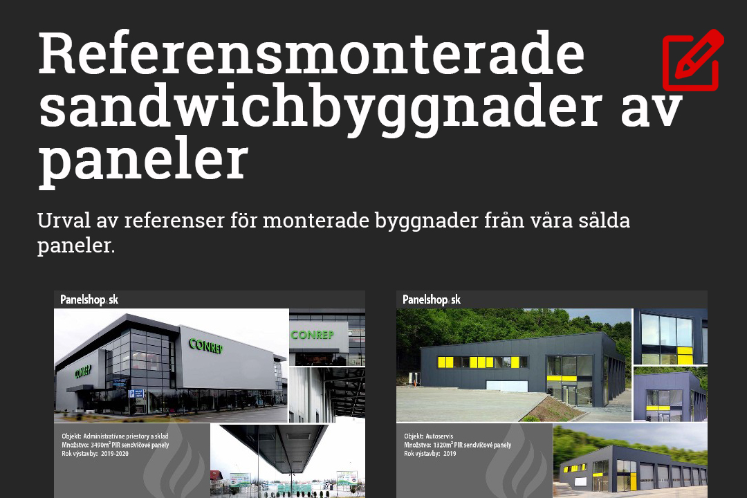 Urval av referensmonterade sandwichbyggnader från våra erbjudna paneler från år 2022 till år 2024. Byggnaderna är till största delen utförda av moderna PIR-paneler eller av paneler med mineralull.
