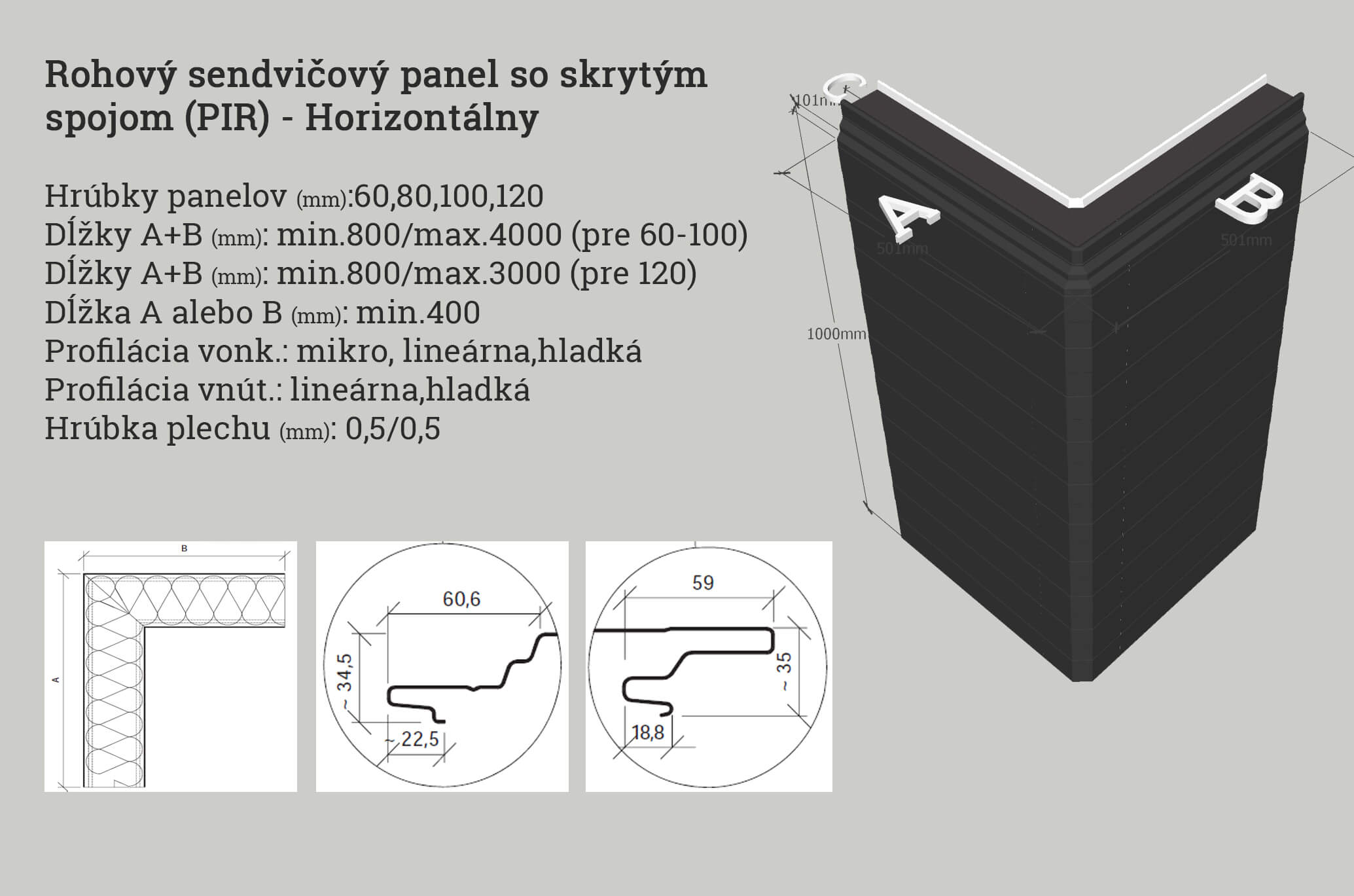 Sandwichhörnpanelen består av två färgade, galvaniserade, profilerade stålplåtar och en polyisocyanurat-kärna (PIR). Plåttjockleken kan vara från 0,4 mm till 0,7 mm. Standardtjockleken på plåtarna är 0,5/0,5 mm med 25/25 μ ytbehandling. Panelerna fästs med dold skarv i horisontell orientering. Panelerna är avsedda för beklädnad av invändiga och utvändiga väggar i stomkonstruktioner.