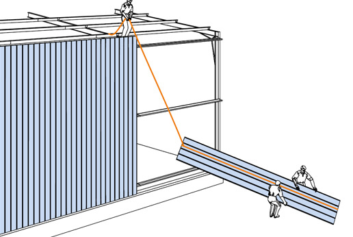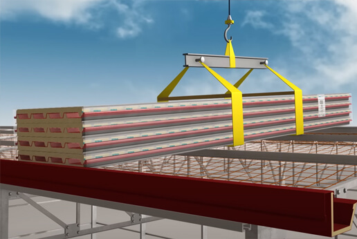 14. Vid takpaneler rekommenderas att med kran flytta hela paketet upp på byggnadens tak med efterföljande infästning. Detta gäller naturligtvis även för väggpaneler, så att paketet är så nära monteringen som möjligt.