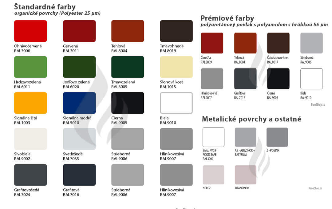 Farby sú dostupné v RAL odtieňoch ako pre sendvičové panely. V ponuke máme dva druhy oplechovacích prvkov 41ks a 33ks. Možnosť zadania vlastných parametrov. Pripravili sme vizualizácie oplechovacieho prvku aj ukážky umiestnenia v našom katalógu »