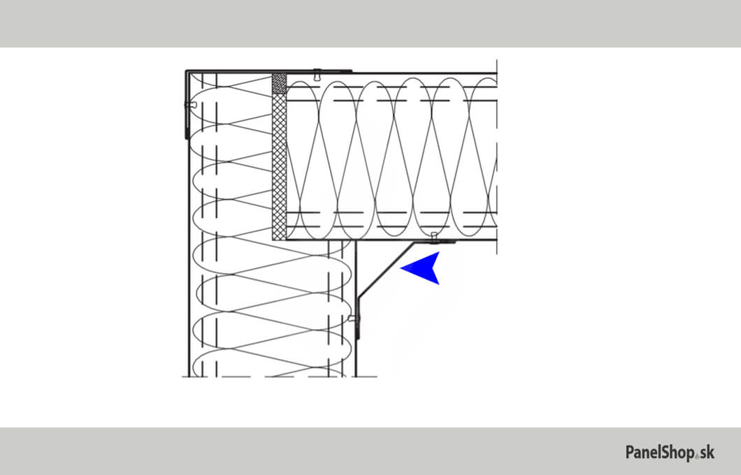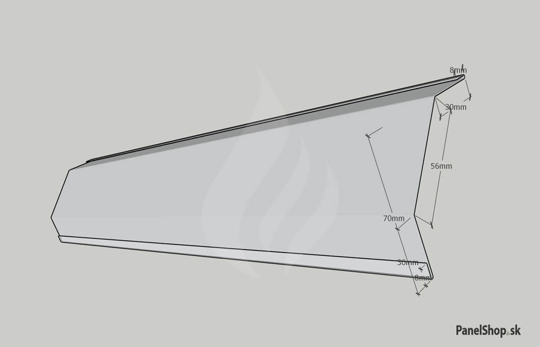 Oplechovanie – (34.1) Šikmý vnútorný roh – Plech_302 pre sendvičové montované stavby. Maximálna dĺžka je 6m. Hrúbka plechu je štandardne 0,5-0,7mm. Možnosť zadania vlastných parametrov.