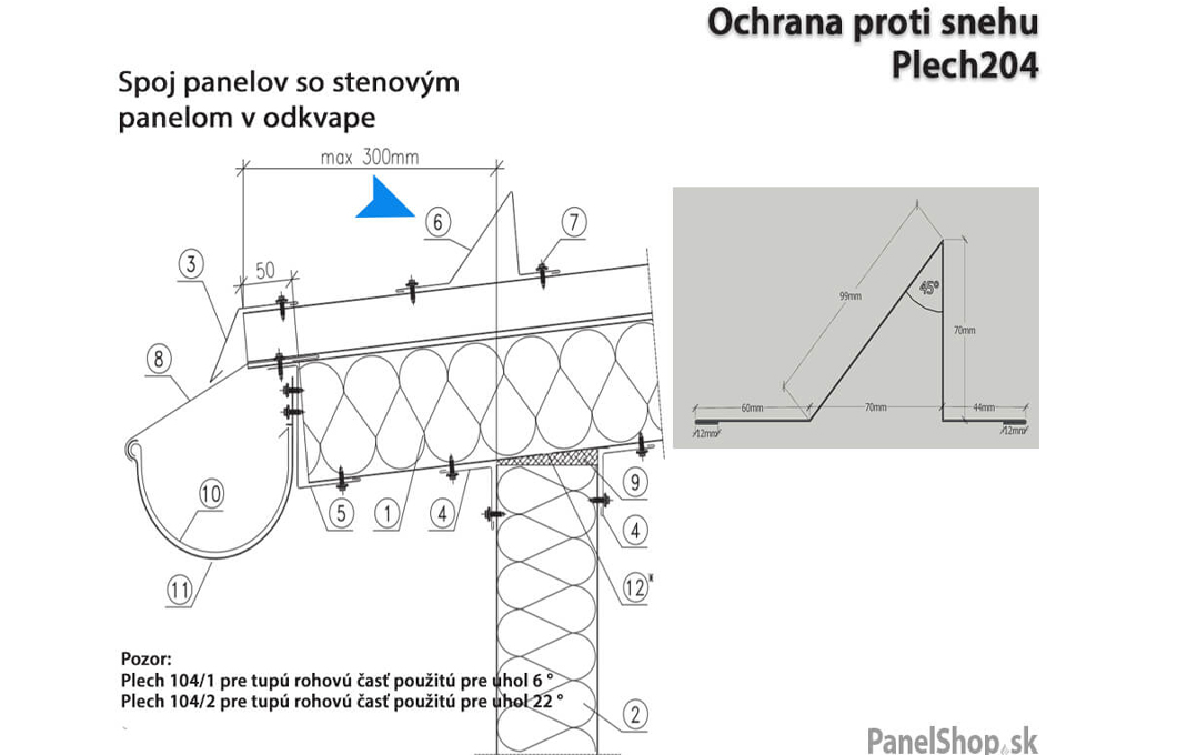 Oplechovanie – (38.1) Protisnehová zábrana – Plech_204 pre sendvičové montované stavby. Maximálna dĺžka je 6m. Hrúbka plechu je štandardne 0,5-0,7mm. Možnosť zadania vlastných parametrov.