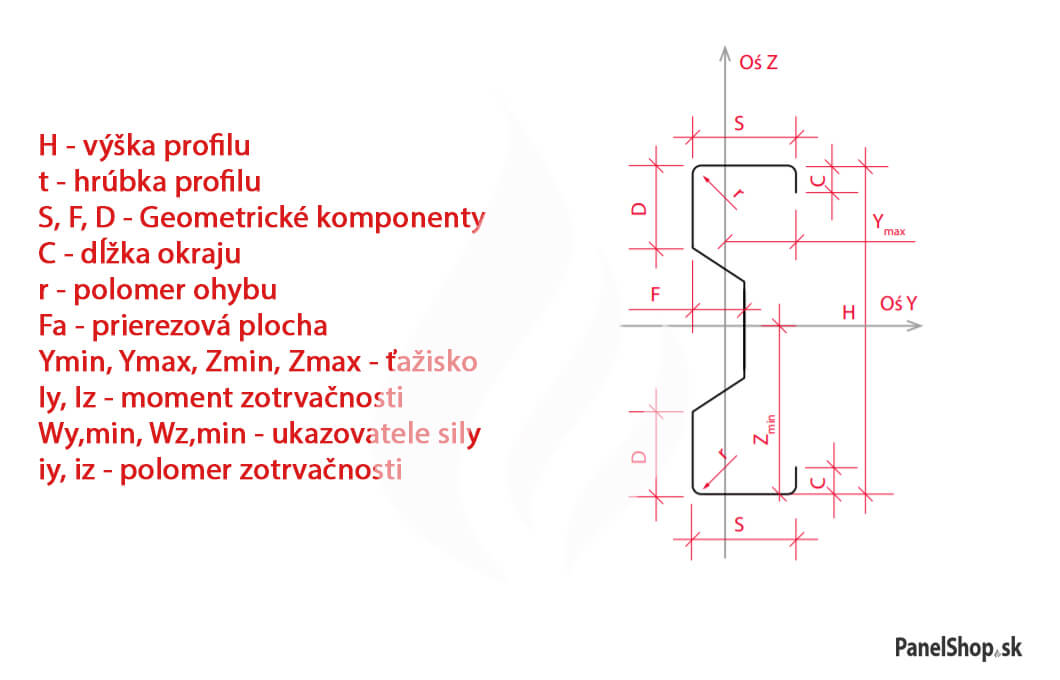 Dôležitý parameter pri výbere je výška H konštrukčného profilu a požadovaná hrúbka plechu, od týchto údajov sa odvíjajú ďalšie parametre (S1,C). Minimálna dĺžka je 1,5m a maximálna 16m.  Typ ocele je hlboko žiarom pozinkovaná oceľ S350GD+Z200 s medzou klzu 350 MPa a vrstvou zinku 275 g/m2.