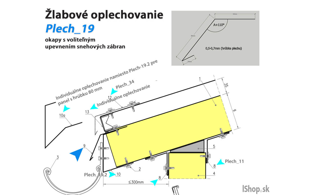 Plåtbeslag är avsedda för sandwichmonterade konstruktioner. Standardlängden på elementen är 2 m, medan den maximala möjliga längden uppgår till 6 m. Plåttjockleken ligger som standard inom intervallet 0,5–0,7 mm. På begäran är det även möjligt att ange individuella mått och parametrar.
