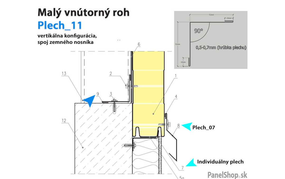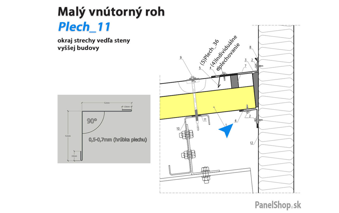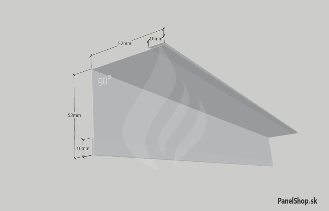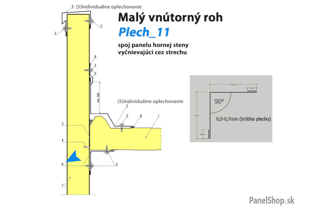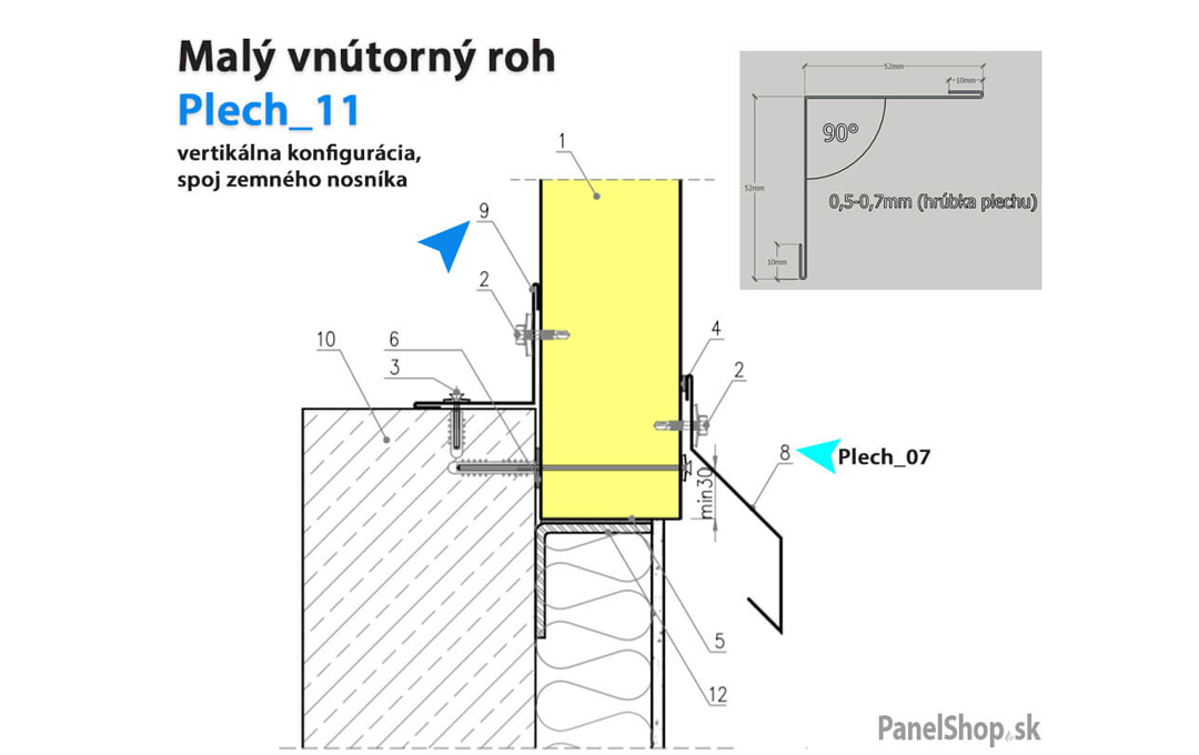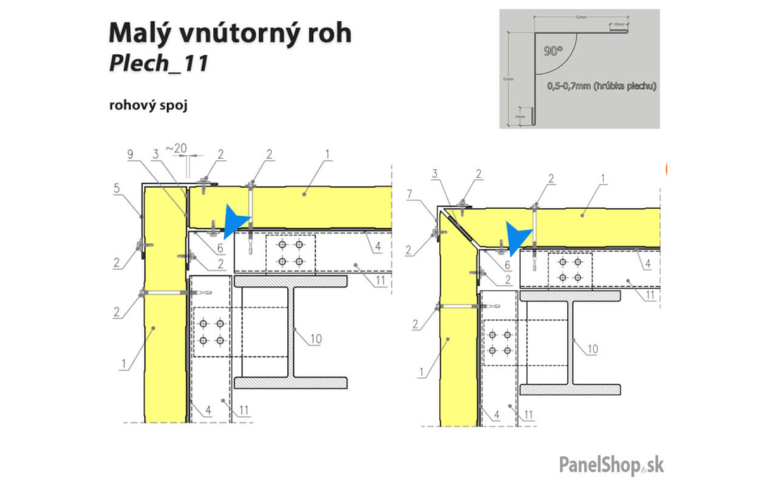 Plåtbeslag – (07.2) Liten invändig hörn – Plåt_11 för sandwichmonterade konstruktioner. Standardlängden är 2 m. Maximal längd är 6 m. Plåttjockleken är som standard 0,5–0,7 mm. Möjlighet att ange egna parametrar.
