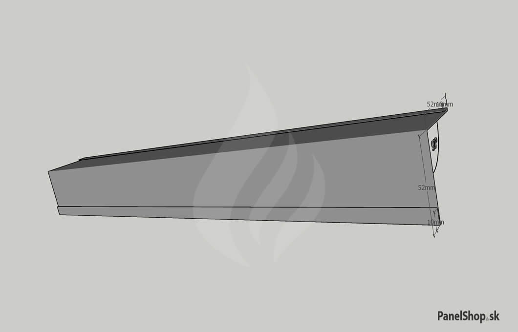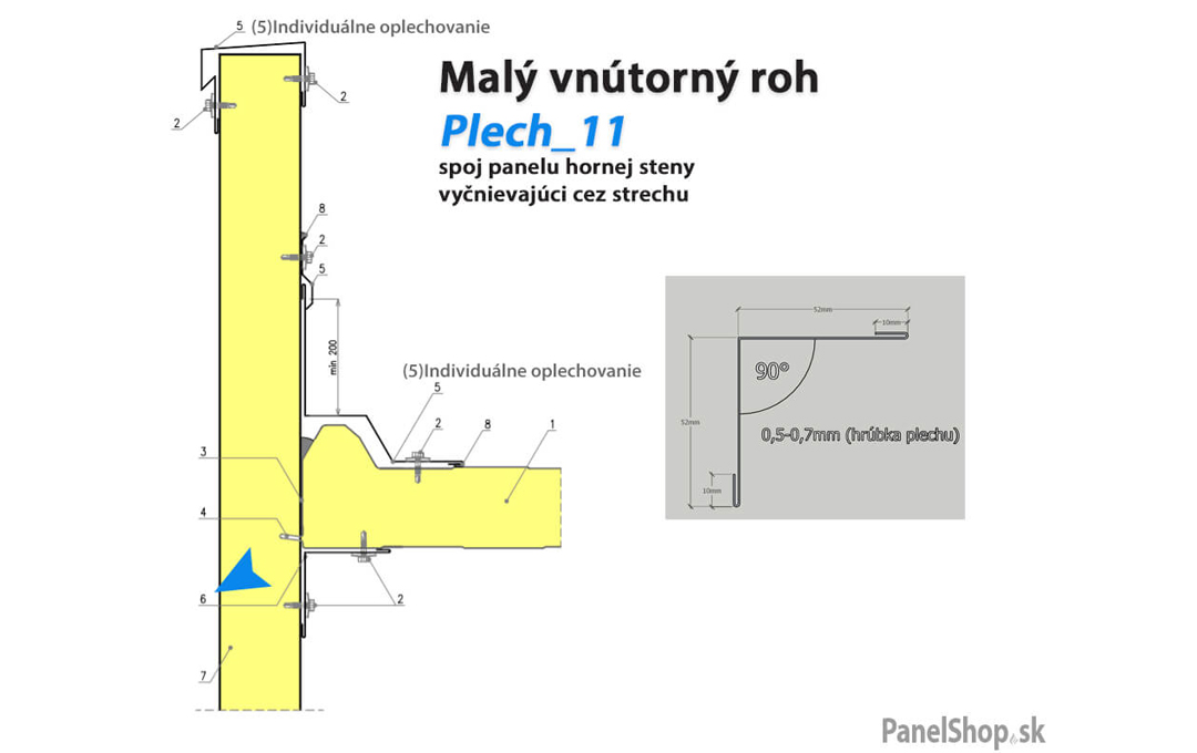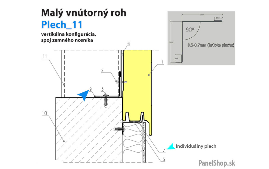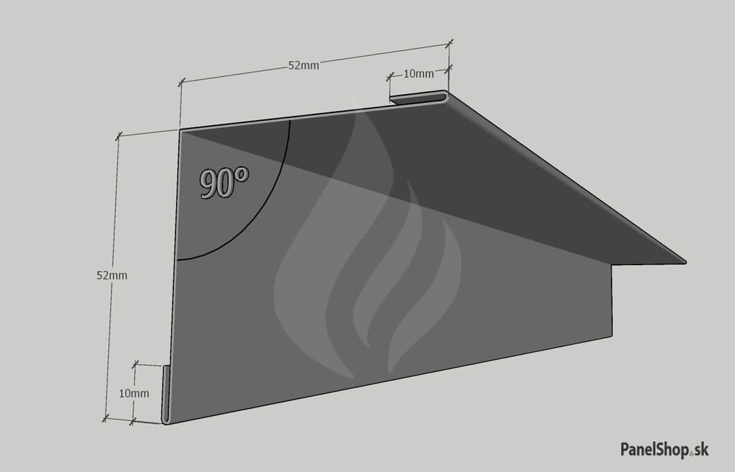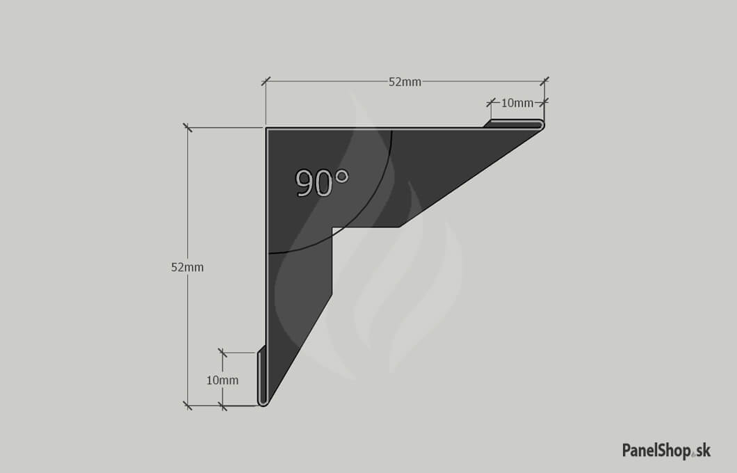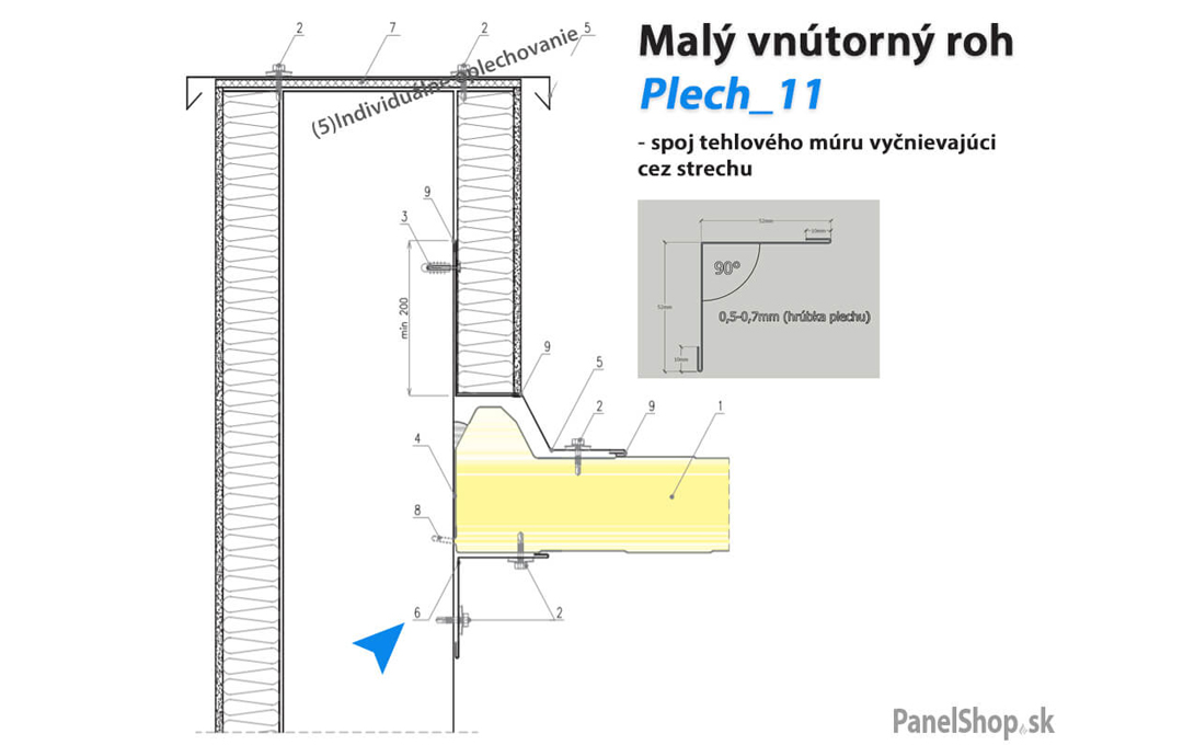 Plåtbeslag – (07.2) Liten invändig hörn – Plåt_11 för sandwichmonterade konstruktioner. Standardlängden är 2 m. Maximal längd är 6 m. Plåttjockleken är som standard 0,5–0,7 mm. Möjlighet att ange egna parametrar.