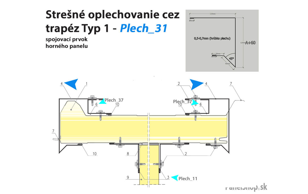 Plåtbeslag för sandwichmonterade konstruktioner. Standardlängden på plåten är 2 m. Maximal längd är 6 m. Plåttjockleken är som standard 0,5–0,7 mm. Möjlighet att ange egna parametrar.