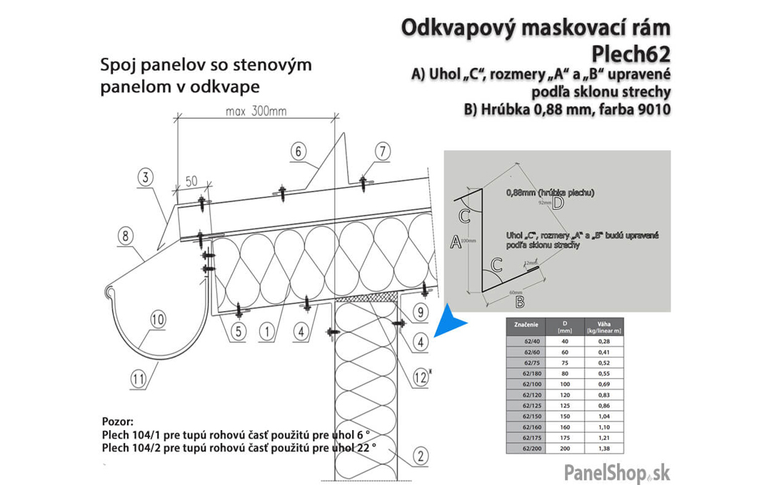 Plåtbeslag är avsedda för sandwichmonterade konstruktioner. Standardlängden på elementen är 2 m, medan den maximala möjliga längden uppgår till 6 m. Plåttjockleken ligger som standard inom intervallet 0,7–0,88 mm. På begäran är det även möjligt att ange individuella mått och parametrar.