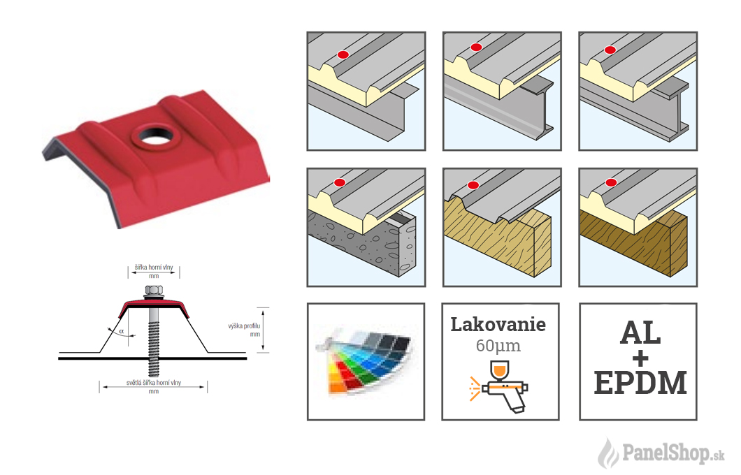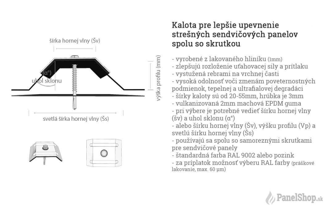 – vyrobené z lakovaného hliníku (1mm) – zlepšujú rozloženie uťahovacej sily a prítlaku – vystužená rebrami na vrchnej časti – vysoká odolnosť voči zmenám poveternostných podmienok, tepelnej a ultrafialovej degradáci – šírky kaloty sú od 20-55mm, hrúbka je 3mm – vulkanizovaná 2mm machová EPDM guma – pri výbere je potrebné vedieť šírku hornej vlny (šv) a uhol sklonu (α°) – alebo šírku hornej vlny (Šv), výšku profilu (Vp) a svetlú šírku hornej vlny (Šs) – používajú sa spolu so samoreznými skrutkami pre sendvičové panely – štandardná farba RAL 9002 alebo pozink – za príplatok možnosť výberu RAL farby (práškové lakovanie, max. 60 µm)