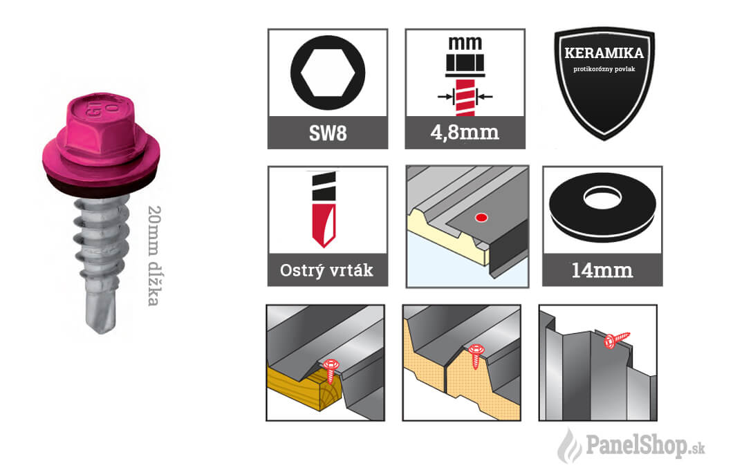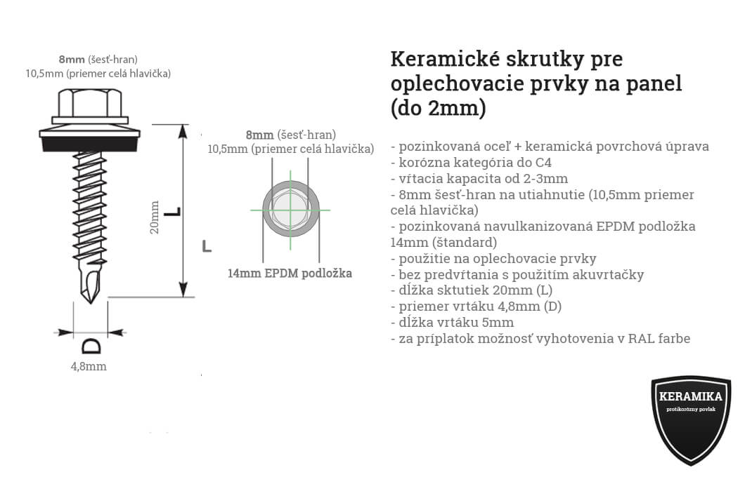 TEX samorezné skrutky sú vyrobené z pozinkovanej úšlachtilej ocele a špeciálnej protikoróznej keramickej úprave. Vŕtacia kapacita je od 2-3mm. Šesť-hraná 8mm závitová hlava (10,5mm priemer celá hlavička). EPDM podložka je pozinkovaná navulkanizovaná v rozmeroch 14mm (štandard). Dĺžka skrutiek je 20mm (L), priemer vrtáku 4,8mm, dĺžka vrtáku 5mm. Korózna kategória do C4. Použitie skrutky je na pripevnenie stenových a strešných oplechovacích prvkov bez predvŕtania s použitím aku-vŕtačky (1000-1800ot/min.) na sendvičové panely. Ide o odporúčané skrutky pre upevnenie oplechovacích prvkov. Možnosť vyhotovania v RAL farbách alebo s farebnými krytkami.
