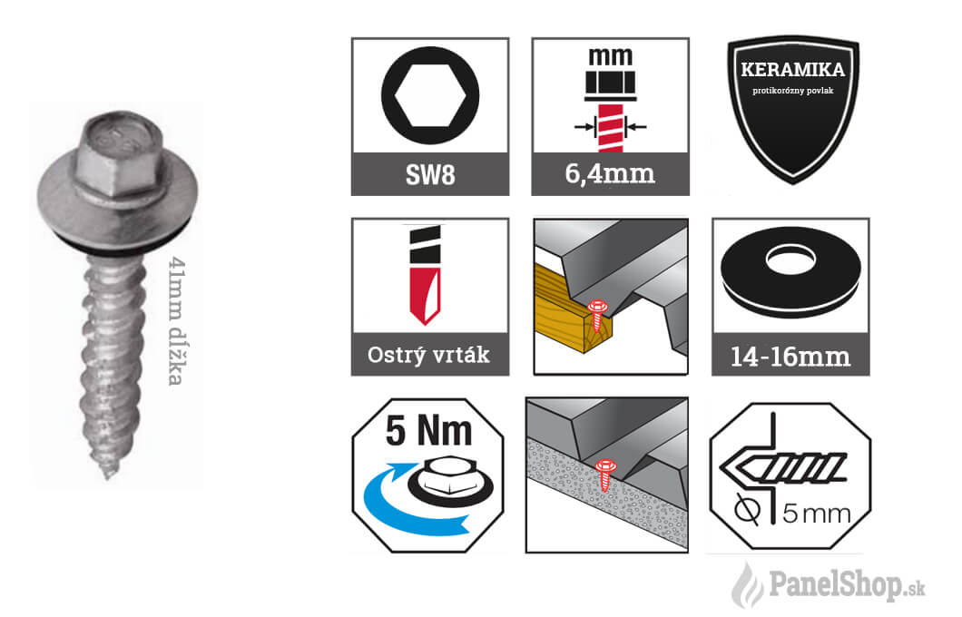 TEX samorezné skrutky sú vyrobené z pozinkovanej úšlachtilej ocele a špeciálnej protikoróznej keramickej úprave. Šesť-hraná 8mm závitová hlava (10,5mm priemer celá hlavička). EPDM podložka je pozinkovaná navulkanizovaná v rozmeroch 14-16mm (štandard). Dĺžka skrutiek je 41mm (L), priemer vrtáku 6,4mm. Korózna kategória do C4. Použitie skrutky je na pripevnenie stenových a strešných oplechovacích prvkov s predvŕtaním a použitím aku-vŕtačky (1000-1800ot/min.) na betónovú konštrukciu. Ide o odporúčané skrutky pre upevnenie oplechovacích prvkov. Možnosť vyhotovania v RAL farbách alebo s farebnými krytkami.