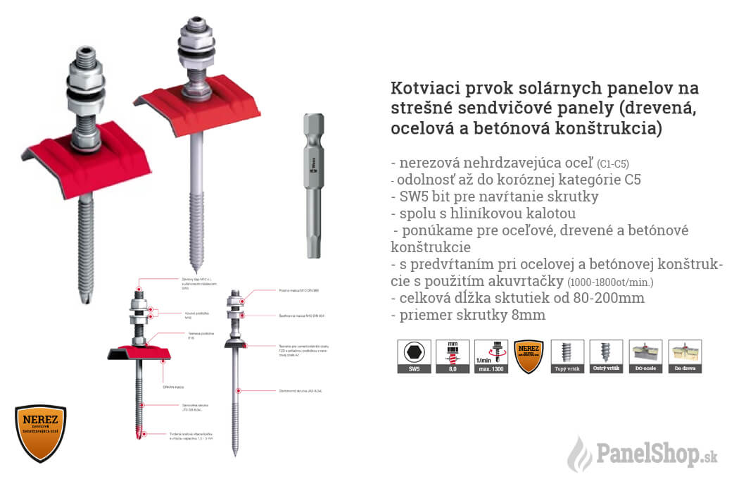 Kotviace prvky pre upevnenie solárnych panelov do oceľovej, drevenej a betónovej konštrukcie. Skrutky sú z nerezovej ocele s kalotou pre strešné panely. Priemer skrutky je 8mm (bit=SW5). Dva typy vrtákov (tupý a ostrý). Celková dĺžka skrutiek je od 80-200mm (informujte sa o vašej potrebnej dĺžke). Korózna kategória do C5. Skrutky majú byť zavŕtané +25mm až 70mm od svornej hrúbky. Pri výbere treba vedieť vŕtaciu kapacitu a svornú hrúbku. Ide o najodolnejšie skrutky pre upevnenie solárnych panelov na strešné sendvičové panely. (ceny sú orientačné, samozrejme poskytujeme množstevné zľavy)