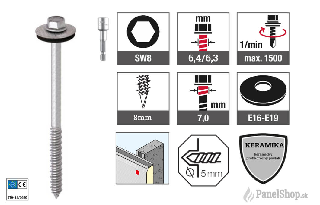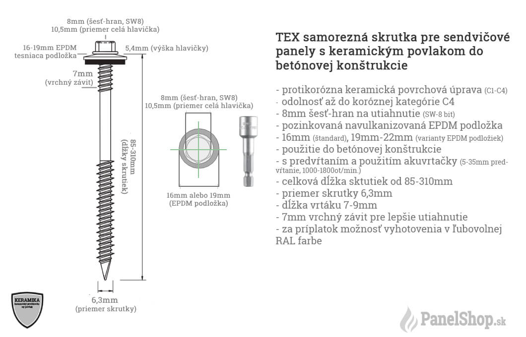 Protikorźne skrutky pre upevnenie sendvičových panelov do betónovej konštrukcie (aj drevenej). Skrutky sú z keramickej povrchovej úpravy s navulkanizovanou pozinkovanou EPDM podložkou s priemerom od 16-22mm bez farby. Hrúbka podložky je 3mm. Priemer skrutky je 6,3/6,4mm, šírka hlavičky je 8mm šesťhran (bit=SW8). Ostrý vrták s predvŕtaním. Celková dĺžka skrutiek je od 85-310mm (informujte sa o vašej potrebnej dĺžke). Korózna kategória do C4. Skrutky majú byť zavŕtané +30mm až 40mm od svornej hrúbky. Odhad množstva je 1,3-1,5ks skrutiek na m² pre senové panely. 1,5-2ks skrutiek na m² pre strešné panely. Pri výbere treba vedieť vŕtaciu kapacitu a svornú hrúbku. Ide o odporúčané skrutky pre upevnenie strešných a nástenných panelov. Možnosť dodania s farebnými krytkami. (ceny sú orientačné, samozrejme poskytujeme množstevné zľavy)