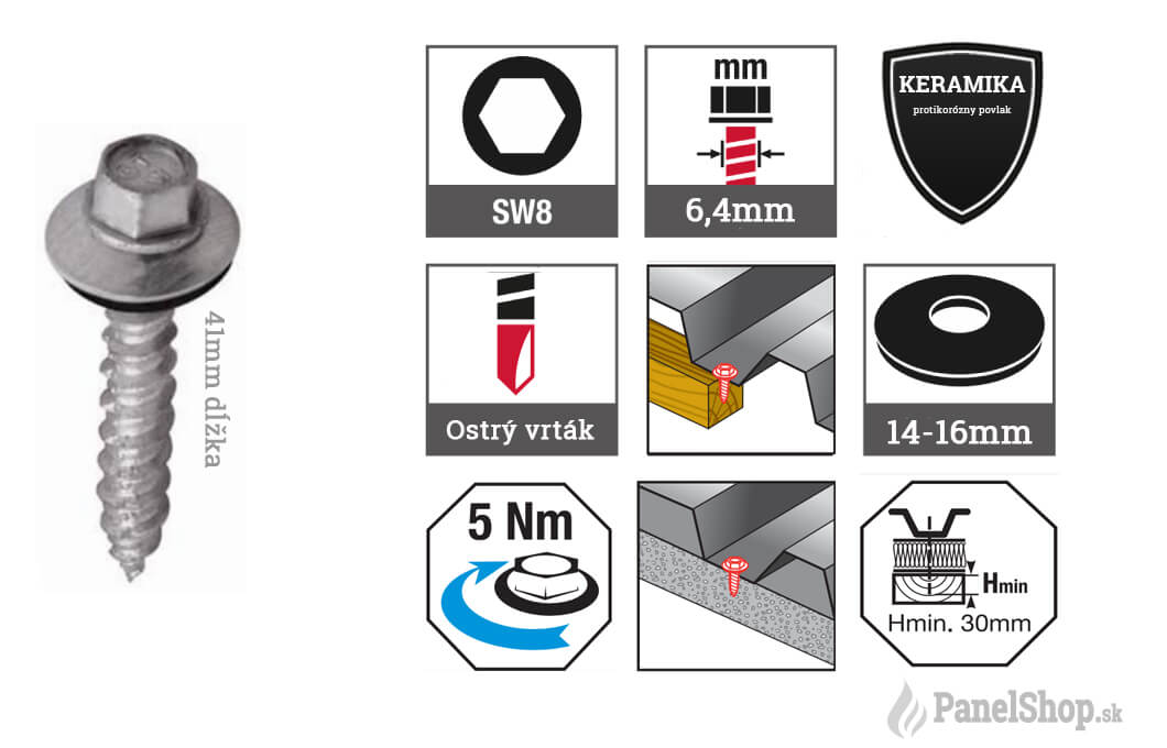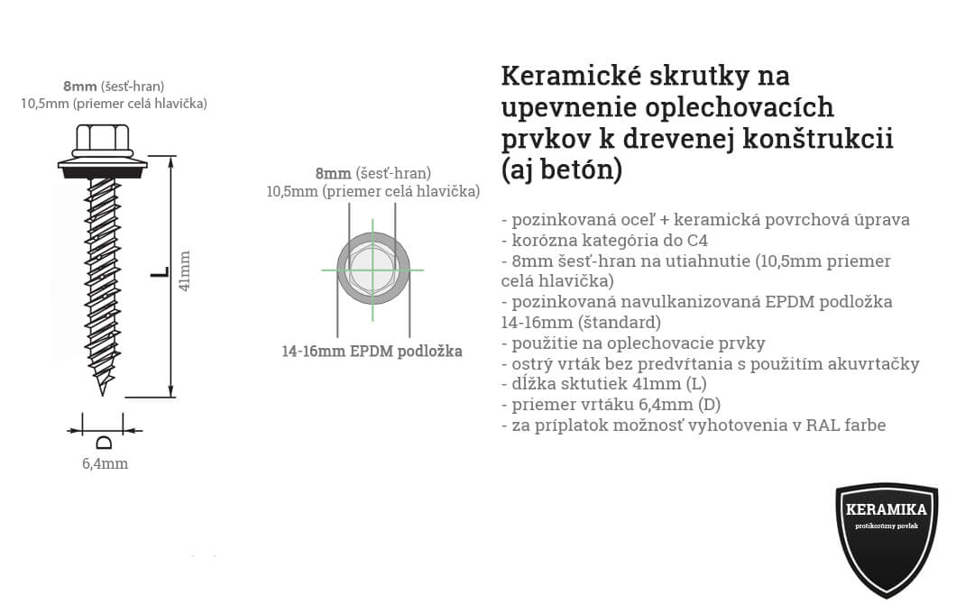 TEX samorezné skrutky sú vyrobené z pozinkovanej úšlachtilej ocele a špeciálnej protikoróznej keramickej úprave. Šesť-hraná 8mm závitová hlava (10,5mm priemer celá hlavička). EPDM podložka je pozinkovaná navulkanizovaná v rozmeroch 16mm (štandard). Dĺžka skrutiek je 41mm (L), priemer vrtáku 6,4mm, ostrý vrták. Korózna kategória do C4. Použitie skrutky je na pripevnenie stenových a strešných oplechovacích prvkov bez predvŕtania s použitím aku-vŕtačky (1000-1800ot/min.) na drevenú konštrukciu. Ide o odporúčané skrutky pre upevnenie oplechovacích prvkov. Možnosť vyhotovania v RAL farbách alebo s farebnými krytkami.