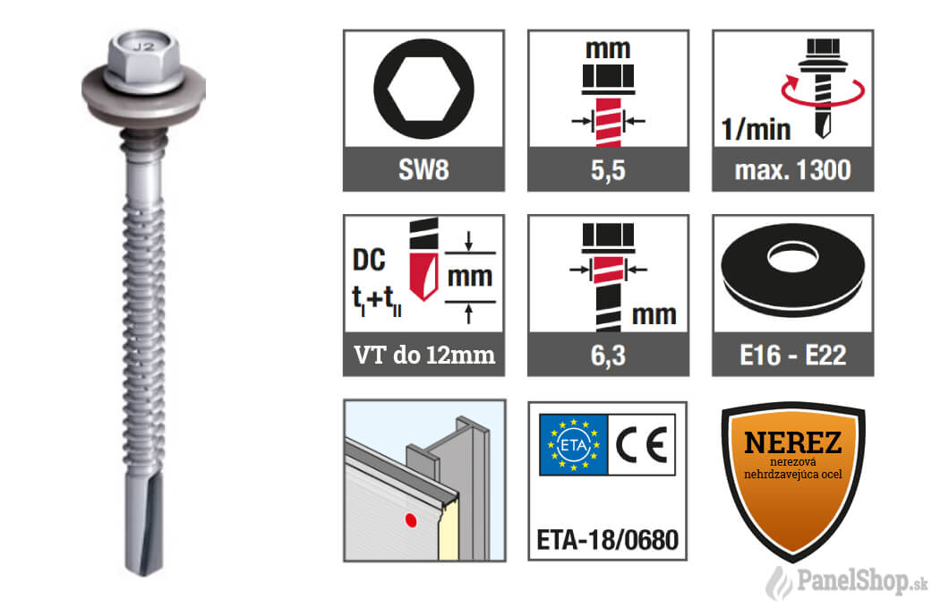Priemer skrutky je 5,5mm, šírka hlavičky je 8mm šesťhran (bit=SW8), dĺžka vrtáku je 15mm. Vŕtacia kapacita je 12mm. Celková dĺžka skrutiek je od 75-300mm (informujte sa o vašej potrebnej dĺžke). Korózna kategória do C5. Najodolnejšie skrutky pre upevnenie strešných a nástenných panelov. Možnosť vyhotovania v RAL farbách alebo s farebnými krytkami.