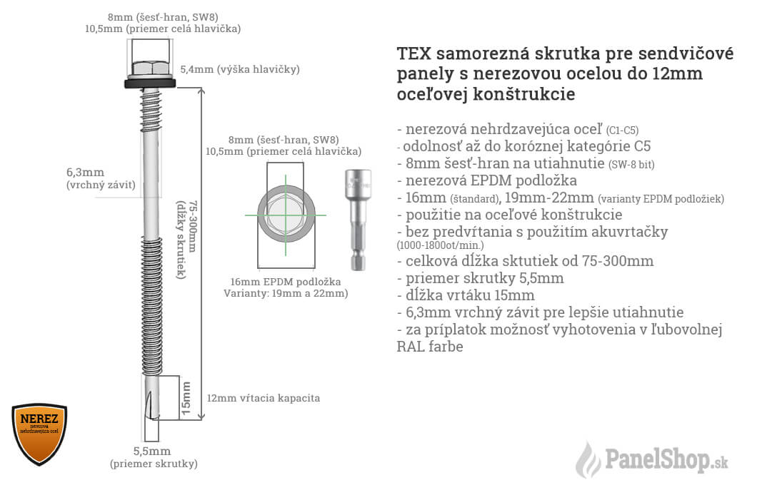 TEX samorezné skrutky pre upevnenie sendvičových panelov do oceľovej konštrukcie. Samorezné skrutky sú z nerezovej ocele s navulkanizovanou a nerezovou EPDM podložkou s priemerom od 16-22mm bez farby. Hrúbka podložky je 3mm. Priemer skrutky je 5,5mm, šírka hlavičky je 8mm šesťhran (bit=SW8). Dĺžka vrtáku je 15mm. Vŕtacia kapacita je 12mm. Celková dĺžka skrutiek je od 75-300mm (informujte sa o vašej potrebnej dĺžke). Korózna kategória do C5. Skrutky majú byť zavŕtané +25mm až 35mm od svornej hrúbky. Odhad množstva je 1,3-1,5ks skrutiek na m² pre senové panely. 1,5-2ks skrutiek na m² pre strešné panely. Pri výbere treba vedieť vŕtaciu kapacitu a svornú hrúbku. Ide o nejodolnejšie skrutky pre upevnenie strešných a nástenných panelov. Možnosť vyhotovania v RAL farbách alebo s farebnými krytkami. (ceny sú orientačné, samozrejme poskytujeme množstevné zľavy)