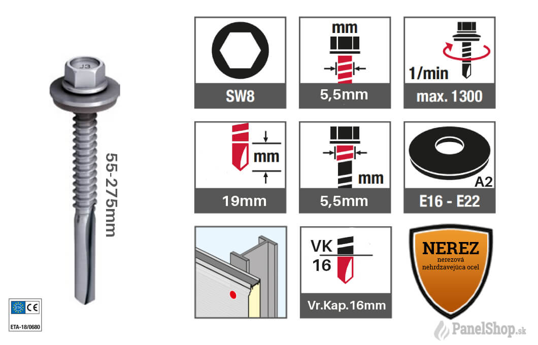 Priemer skrutky je 5,5mm, šírka hlavičky je 8mm šesťhran (bit=SW8), dĺžka vrtáku je 19mm. Vŕtacia kapacita je 16mm. Celková dĺžka skrutiek je od 55-275mm (informujte sa o vašej potrebnej dĺžke). Korózna kategória do C5. Odporúčané skrutky pre upevnenie strešných a nástenných panelov. Možnosť vyhotovania v RAL farbách alebo s farebnými krytkami.