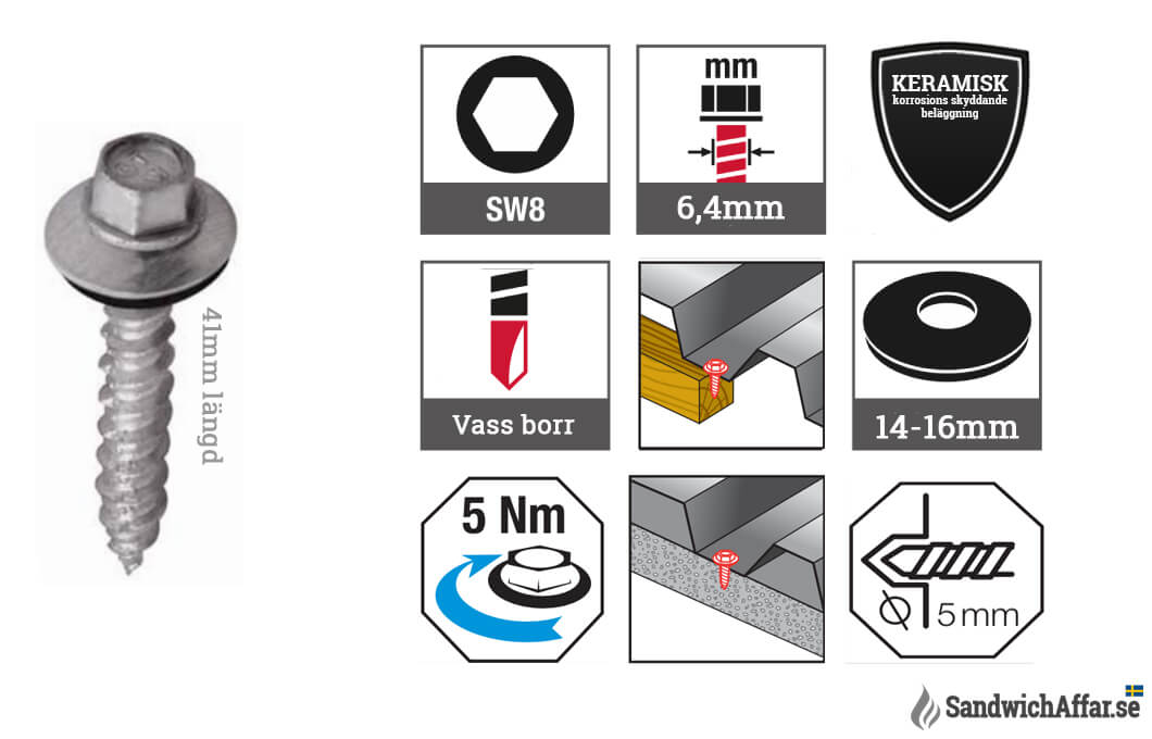Skruven används för att fästa vägg- och takplåtelement med förborrning och med en batteridriven borrmaskin (1000-1800 rpm) på en betongkonstruktion. Skruvarnas längd är från 41 mm (L), borrdiameter 6,4 mm. Dessa är rekommenderade skruvar. Mot en extra avgift är det möjligt att tillverka den i valfri RAL-färg eller köpa färgade lock.