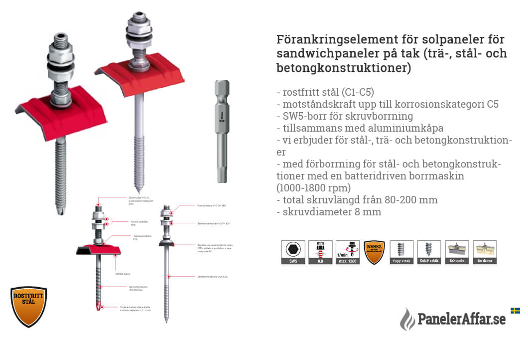Förankringselement för montering av solpaneler på stål-, trä- och betongkonstruktioner. Skruvarna är tillverkade av rostfritt stål med en kupol för takpaneler. Skruvdiametern är 8 mm (borrkrona=SW5). Två typer av borrkronor (trubbiga och vassa). Skruvarnas totala längd är från 80-200 mm (fråga om önskad längd). Korrosionskategori upp till C5. Skruvarna ska borras +25 mm till 70 mm från klämtjockleken. När du väljer behöver du veta borrkapaciteten och klämtjocklek. Dessa är de mest hållbara skruvarna för att fästa solpaneler på takpaneler. (Priserna är vägledande, vi erbjuder givetvis mängdrabatter)