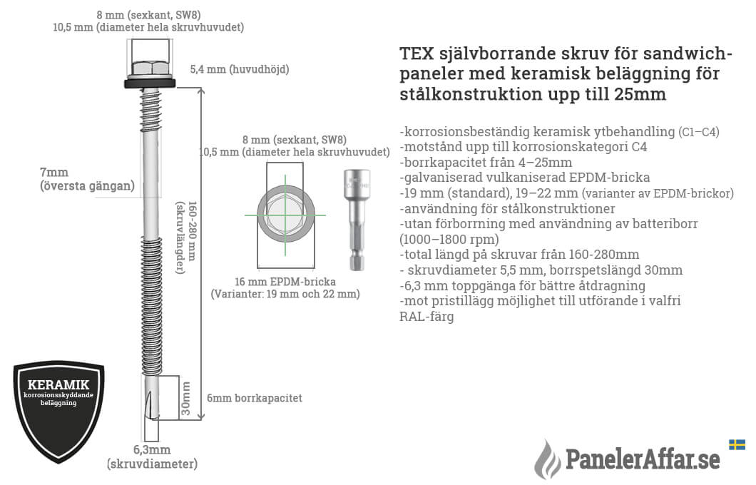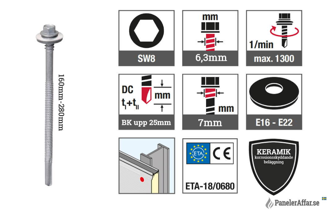 Skruvens diameter är 6,3 mm, huvudets bredd är 8 mm sexkant (bit=SW8), borrlängden är 30 mm. Borrkapaciteten är 25 mm. Skruvarnas totala längd är från 160-280 mm (fråga om önskad längd). Korrosionskategori upp till C4. Rekommenderade skruvar för montering av tak- och väggpaneler. Möjlighet att tillverka i RAL-färger eller med färgade lock.