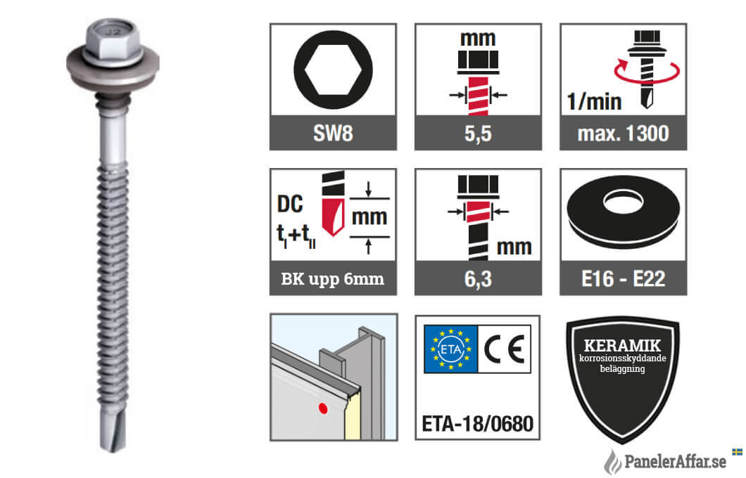 Skruvens diameter är 5,5 mm, huvudets bredd är 8 mm sexkant (bit=SW8), borrlängden är 10 mm. Borrkapaciteten är 6 mm. Skruvarnas totala längd är från 65-335 mm (fråga om önskad längd). Korrosionskategori upp till C1-C4. Standardskruvar rekommenderas för montering av tak- och väggpaneler. Möjlighet att tillverka i RAL-färger eller med färgade lock.