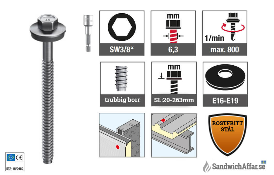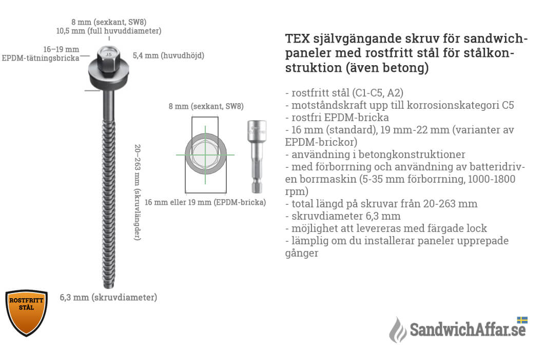 Skruvens diameter är 5,3 mm, huvudets bredd är 8 mm sexkant (bit=SW8), trubbig borr med förborrning. Skruvarnas totala längd är från 20-263 mm (fråga om önskad längd). Korrosionskategori upp till C5. De mest hållbara skruvarna för infästning av tak- och väggpaneler på stål- och betongkonstruktioner. Lämplig om du installerar paneler upprepade gånger. Möjlighet att leverera med färgade lock.