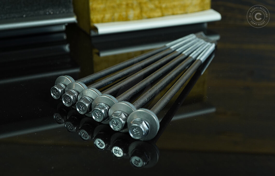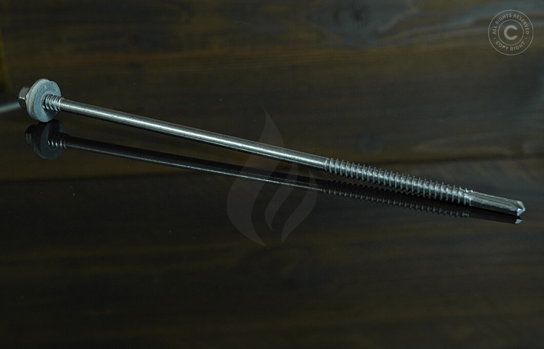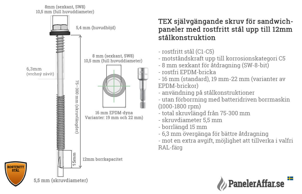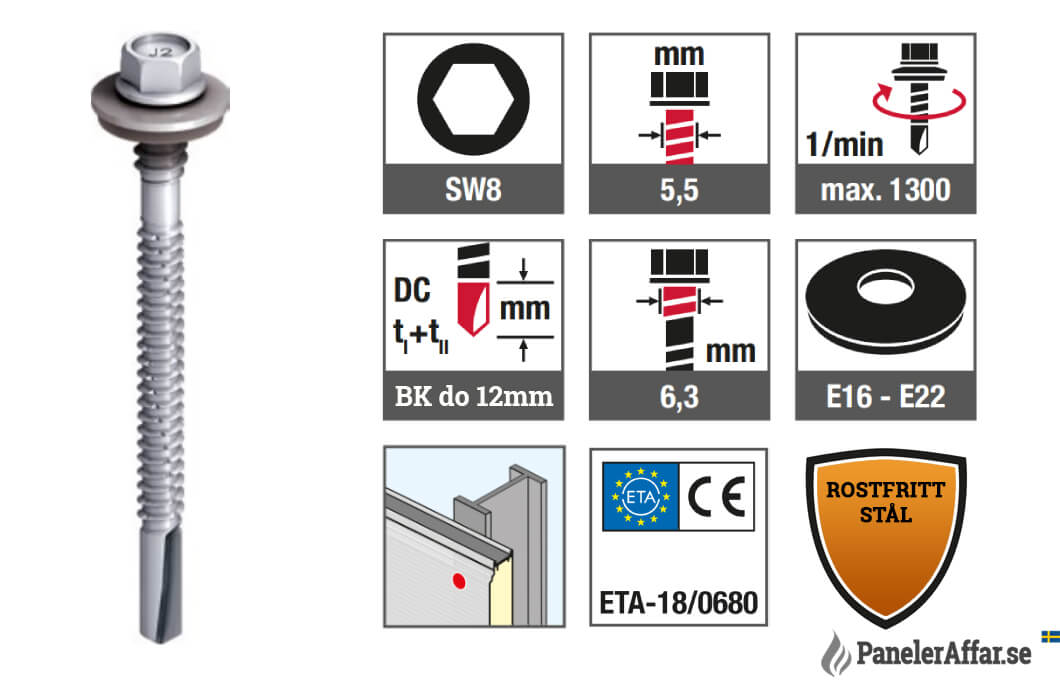 Skruvens diameter är 5,5 mm, huvudets bredd är 8 mm sexkant (bit=SW8), borrlängden är 15 mm. Borrkapaciteten är 12 mm. Skruvarnas totala längd är från 75-300 mm (fråga om önskad längd). Korrosionskategori upp till C5. De mest hållbara skruvarna för infästning av tak- och väggpaneler. Möjlighet att tillverka i RAL-färger eller med färgade lock.