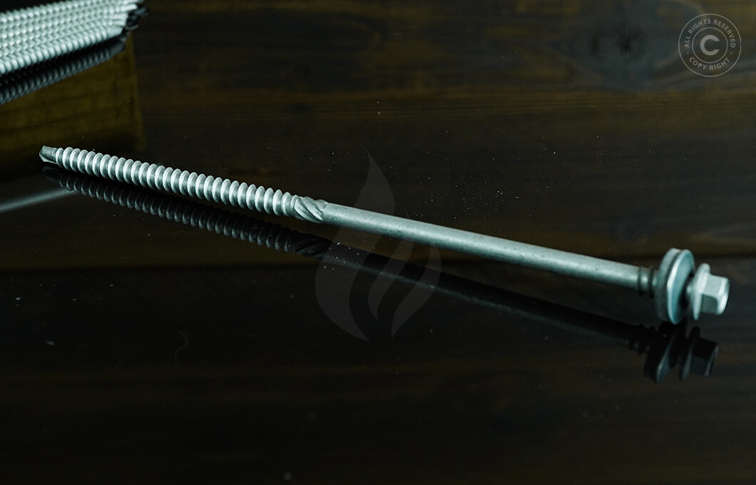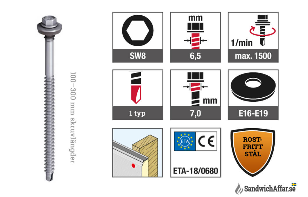 Skruvens diameter är 6,3 mm, huvudets bredd är 8 mm sexkant (bit=SW8), borrlängden är 7 mm. Skruvarnas totala längd är från 100-300 mm (fråga om önskad längd). Korrosionskategori upp till C5. De mest hållbara skruvarna för montering av tak- och väggpaneler. Möjlighet att tillverka i RAL-färger eller med färgade lock.